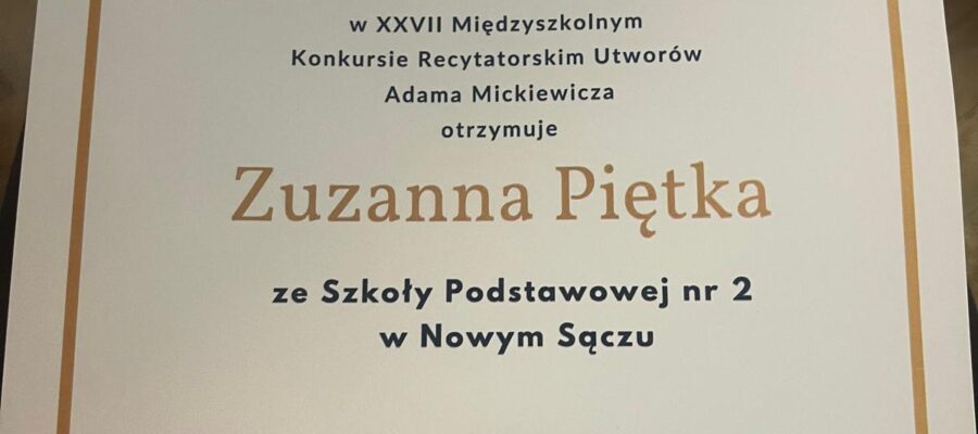 Zuzanna Piętka, uczennica klasy 3b zajęła II miejsce w XXVII Międzyszkolnym Konkursie Recytatorskim Utworów Adama Mickiewicza.